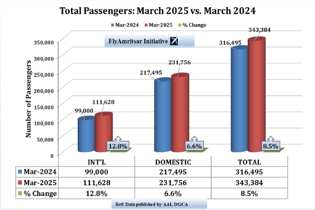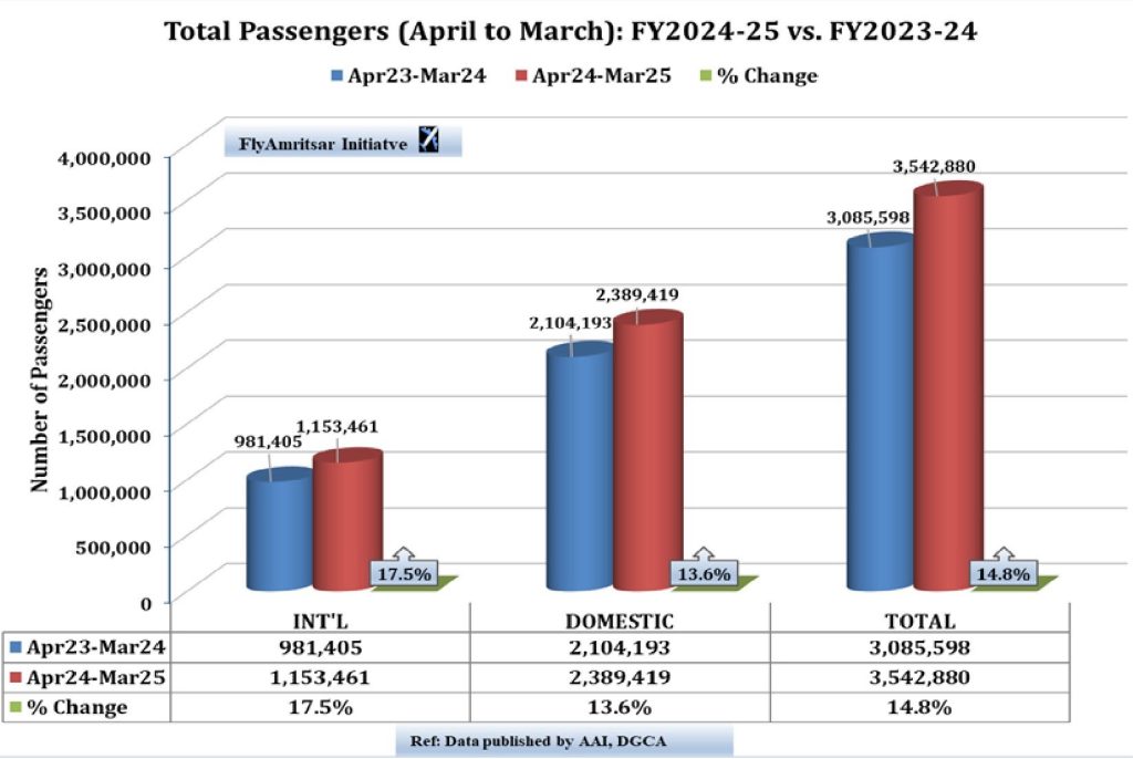 ਅੰਮ੍ਰਿਤਸਰ ਦੇ ਸ੍ਰੀ ਗੁਰੂ ਰਾਮ ਦਾਸ ਜੀ ਅੰਤਰਰਾਸ਼ਟਰੀ ਹਵਾਈ ਅੱਡੇ ਨੇ 31 ਮਾਰਚ ਨੂੰ ਖਤਮ ਹੋਏ ਵਿੱਤੀ ਵਰੇ੍ਹ 2024-25 ਦੌਰਾਨ 3.5 ਮਿਲੀਅਨ (35-ਲੱਖ) ਯਾਤਰੀਆਂ ਦੀ ਗਿਣਤੀ ਨੂੰ ਪਾਰ ਕਰਕੇ ਇੱਕ ਨਵਾਂ ਰਿਕਾਰਡ ਕਾਇਮ ਕੀਤਾ ਹੈ। ਮਾਰਚ 2025 ਲਈ ਏਅਰਪੋਰਟ ਅਥਾਰਟੀ ਆਫ ਇੰਡੀਆ ਦੁਆਰਾ ਜਾਰੀ ਕੀਤੇ ਗਏ ਅੰਕੜਿਆਂ ਦੇ ਵਿਸ਼ਲੇਸ਼ਣ ਤੋਂ ਇਹ ਤੱਥ ਸਾਹਮਣੇ ਆਏ ਹਨ ਕਿ ਅੰਮ੍ਰਿਤਸਰ ਹਵਾਈ ਅੱਡੇ ਤੋਂ ਵਿੱਤੀ ਸਾਲ 2024-25 (1 ਅਪ੍ਰੈਲ 2024 ਤੋਂ 31 ਮਾਰਚ 2025) ਦੌਰਾਨ 35,42,880 ਯਾਤਰੀਆਂ ਨੇ ਹਵਾਈ ਸਫਰ ਕੀਤਾ। ਇਸ ਵਿੱਚ 11,53,461 ਅੰਤਰਰਾਸ਼ਟਰੀ ਅਤੇ 23,89,419 ਘਰੇਲੂ ਯਾਤਰੀ ਸ਼ਾਮਲ ਹਨ। ਇਹ ਅੰਕੜੇ ਪਿਛਲੇ ਵਿੱਤੀ ਸਾਲ ਦੇ ਮੁਕਾਬਲੇ 14.8% ਪ੍ਰਤੀਸ਼ਤ ਵੱਧ ਹਨ, ਜੱਦ ਇੱਥੋਂ ਕੁੱਲ 30.86 ਲੱਖ ਯਾਤਰੀਆਂ ਨੇ ਉਡਾਣ ਭਰੀ ਸੀ। ਪਿਛਲੇ ਵਿੱਤੀ ਸਾਲ ਦੇ ਮੁਕਾਬਲੇ ਅੰਤਰਰਾਸ਼ਟਰੀ ਯਾਤਰੀਆਂ ਦੀ ਗਿਣਤੀ ਵਿੱਚ ਇਸ ਸਾਲ 17.5% ਅਤੇ ਘਰੇਲੂ ਯਾਤਰੀਆਂ ਵਿੱਚ 13.6% ਦਾ ਵਾਧਾ ਹੋਇਆ ਹੈ।