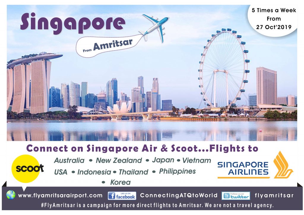28- ਅਕਤੂਬਰ -2019 ਤੋਂ ਸਕੂਟ ਏਅਰਲਾਈਨ (ਸਿੰਗਾਪੁਰ ਏਅਰਲਾਇੰਸ ਦੀ ਇੱਕ ਘੱਟ ਕਿਰਾਏ ਵਾਲੀ ਏਅਰਲਾਈਨ) ਵਲੋਂ ਅੰਮ੍ਰਿਤਸਰ – ਸਿੰਗਾਪੁਰ ਸੈਕਟਰ ‘ਤੇ ਆਪਣੀ ਉਡਾਣ ਹਫ਼ਤੇ ਵਿੱਚ 4 ਦਿਨ ਤੋਂ ਵਧਾ ਕੇ 5 ਦਿਨ ਕੀਤੀ ਜਾਵੇਗੀ । ਉਹ ਹੁਣ ਸਿੱਧਾ ਪੰਜਾਬ ਉਤਰ ਸਕਦੇ ਹਨ ਤੇ ਉਹਨਾਂ ਨੂੰ ਦਿੱਲੀ ਜਾਣ ਦੀ ਲੋੜ ਨਹੀ। ਪੰਜਾਬੀਆਂ ਨੂੰ ਇਹਨਾਂ ਉਡਾਣਾਂ ਨੂੰ ਤਰਜੀਹ ਦੇਣੀ ਚਾਹੀਦੀ ਹੈ। ਇਹਨਾਂ ਉਡਾਣਾਂ ਦੀ ਸਫਲਤਾਂ ਨਾਲ ਹੋਰ ਹਵਾਈ ਕੰਪਨੀਆਂ ਵੀ ਆਉਣਗੀਆਂ ਤੇ ਹੋਰ ਉਡਾਣਾਂ ਸ਼ੁਰੂ ਹੋਣਗੀਆਂ।