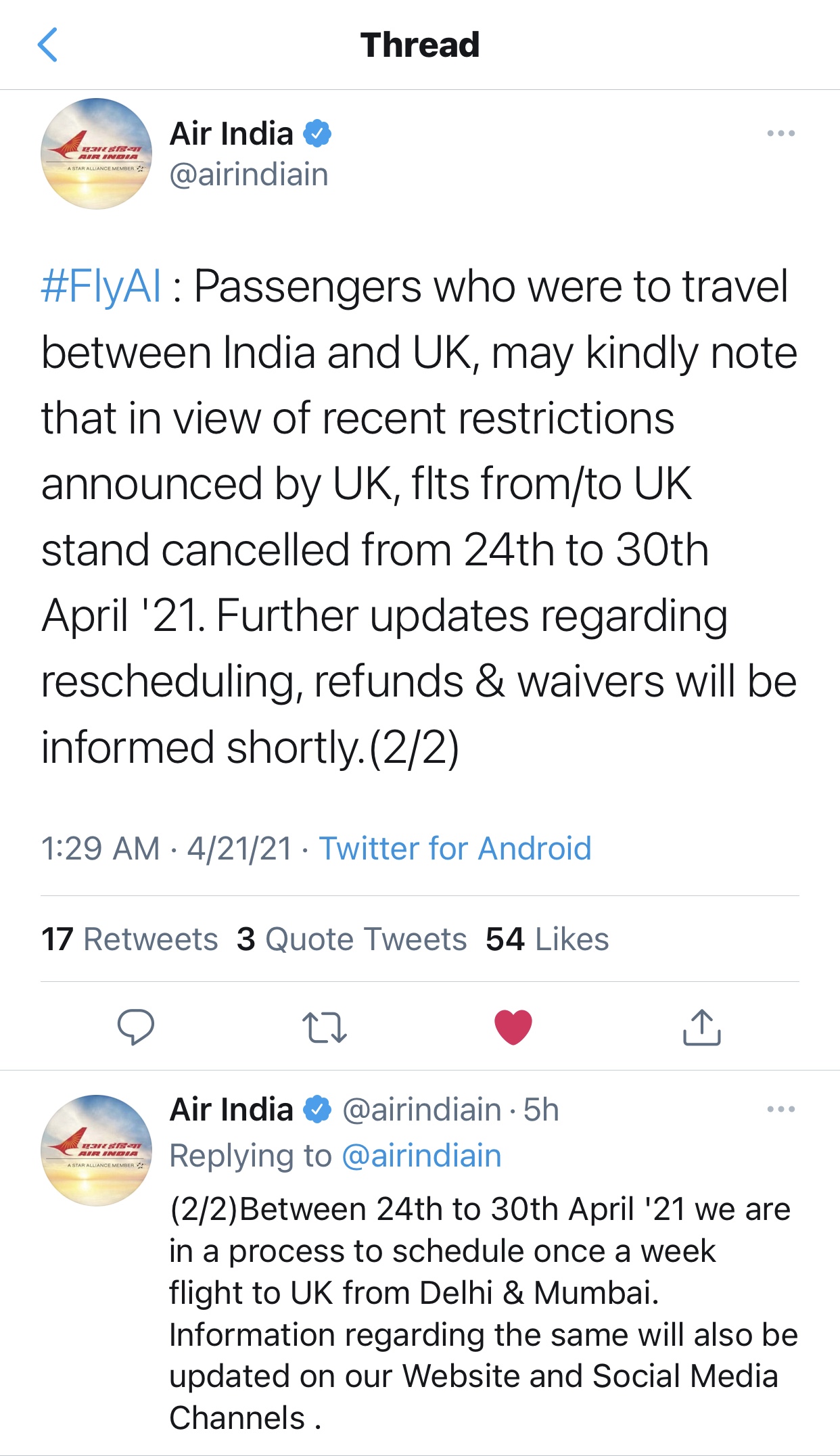 Air India also posted that “Passengers who were to travel between India and UK, may kindly note that in view of recent restrictions announced by UK, flts from/to UK stand cancelled from 24th to 30th April ’21. Further updates regarding rescheduling, refunds & waivers will be informed shortly.”