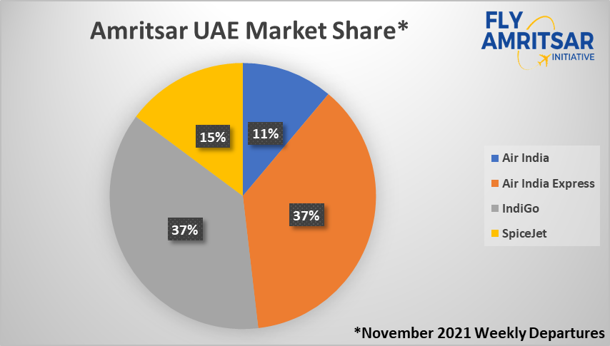IndiGo and Air India Express are currently the capacity leaders of Amritsar’s UAE market, with over 37% each, followed by SpiceJet with 15% and Air India with 11%.