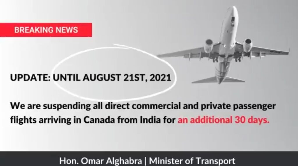 The Canadian Minister of Transport, Hon’ble Omar Alghabra announced via Twitter, “Protecting the health and safety of Canadians is our top priority. After reviewing the current international Covid situation we have decided to renew the direct flight ban between Canada and India for 30 days, to August 21st, 2021.”