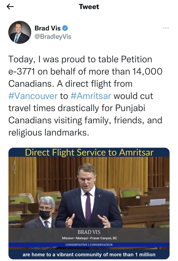 March 7, 2022: FlyAmritsar Initiative, a civil society global initiative for connecting Amritsar airport to destinations around the World, has expressed gratitude to Canadian Member of Parliament Brad Vis (representing Mission-Matsqui-Fraser Canyon in British Columbia) and Shadow Minister for Pacific Economic Development for tabling a petition in the Canadian parliament requesting the Government to proactively advocate for direct flights between Vancouver/Toronto to Amritsar in India.
