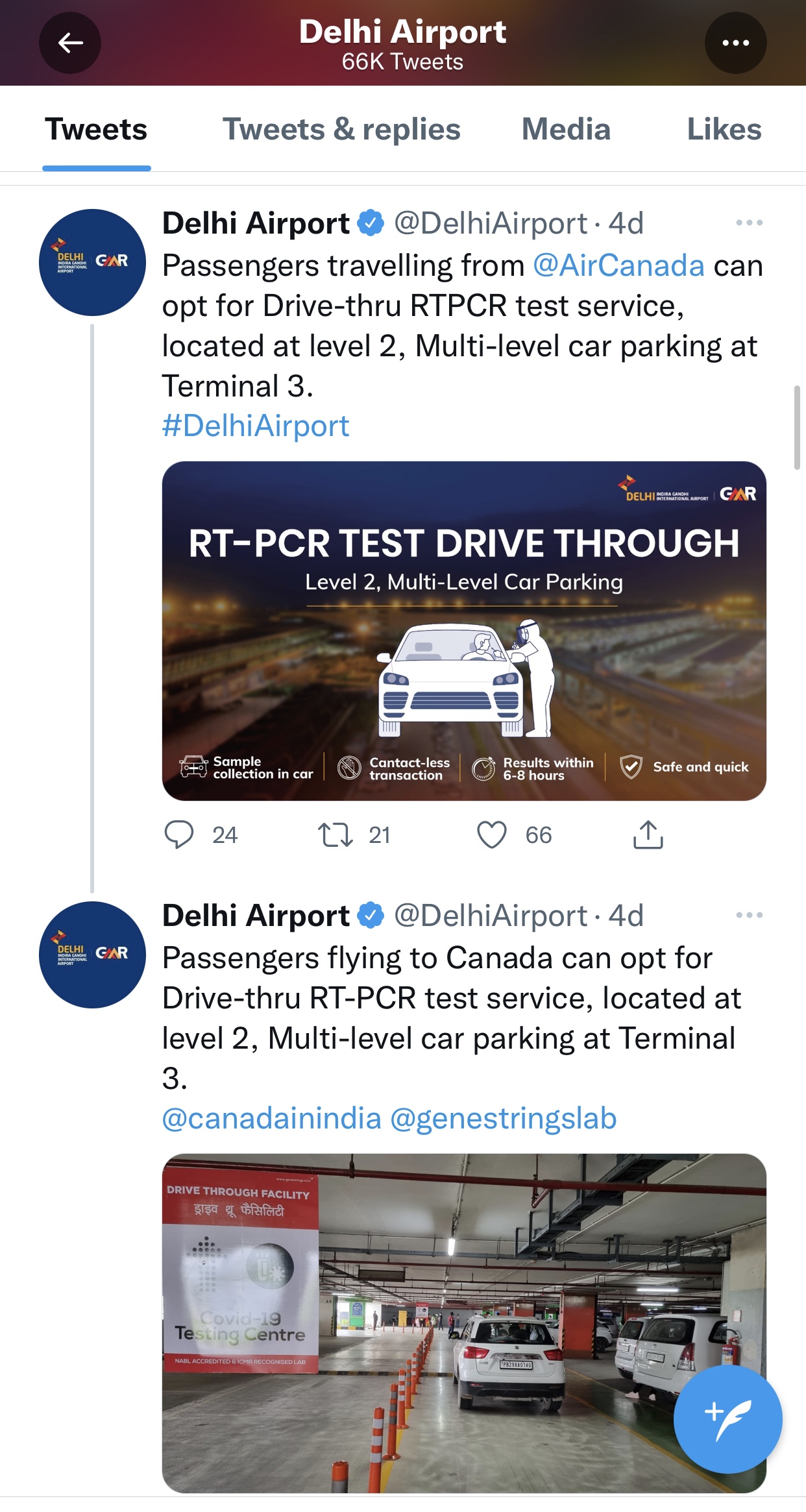 In a Tweet, the Delhi Airport posted, “Passengers travelling from @AirCanada can opt for Drive-thru RTPCR test service, located at level 2, Multi-level car parking at Terminal 3.”