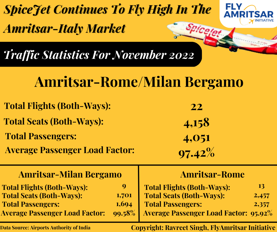 ਅੰਮ੍ਰਿਤਸਰ-#ਮਿਲਾਨ ਬਰਗਾਮੋ ਰੂਟ ‘ਤੇ ਇਹ ਔਸਤ 99.58% ਫੀਸਦੀ ਸੀ ਜਿਸ ਤੋਂ ਇਹ ਜ਼ਾਹਰ ਹੁੰਦਾ ਹੈ ਕਿ ਇਹ ਉਡਾਣਾਂ ਨਵੰਬਰ ਦੇ ਮਹੀਨੇ ਵਿੱਚ ਪੂਰੀਆਂ ਭਰੀਆਂ ਹੋਈਆਂ ਸਨ। ਅੰਮ੍ਰਿਤਸਰ- ਰੋਮ ਦਰਮਿਆਨ ਉਡਾਣਾਂ ਵਿੱਚ ਯਾਤਰੀਆਂ ਦੀ ਔਸਤ ਗਿਣਤੀ 95.92% ਫੀਸਦੀ ਸੀ।
