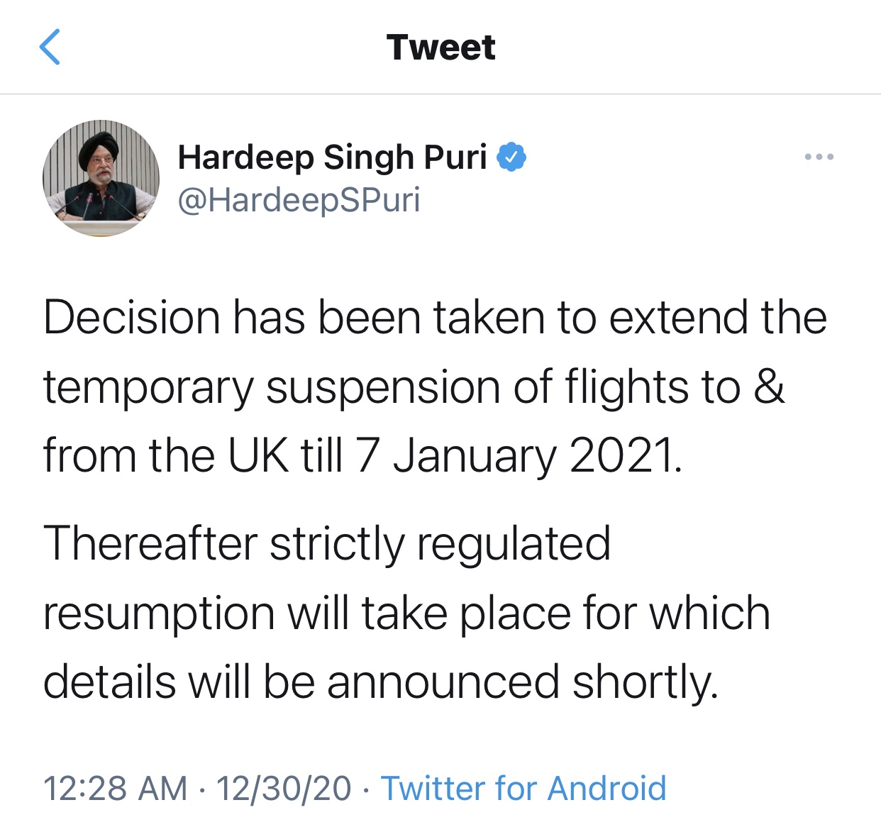 In a tweet and Facebook post, Ministry of Civil Aviation, Government of India Minister Hardeep Singh Puri said that the resumption post January 7 will take place in a “strictly regulated” manner, but the detailed guidelines are yet to be issued by the government.